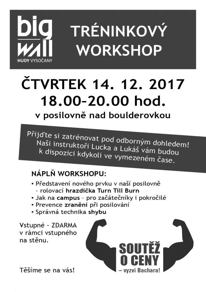 Přijďte si zatrénovat pod odborným dohledem! Připravili jsme pro vás tréninkový workshop, který se uskuteční ve čtvrtek 14. 12. 2017 od 18.00 do 20.00 hod. V prostoru posilovny nad boulderovkou.