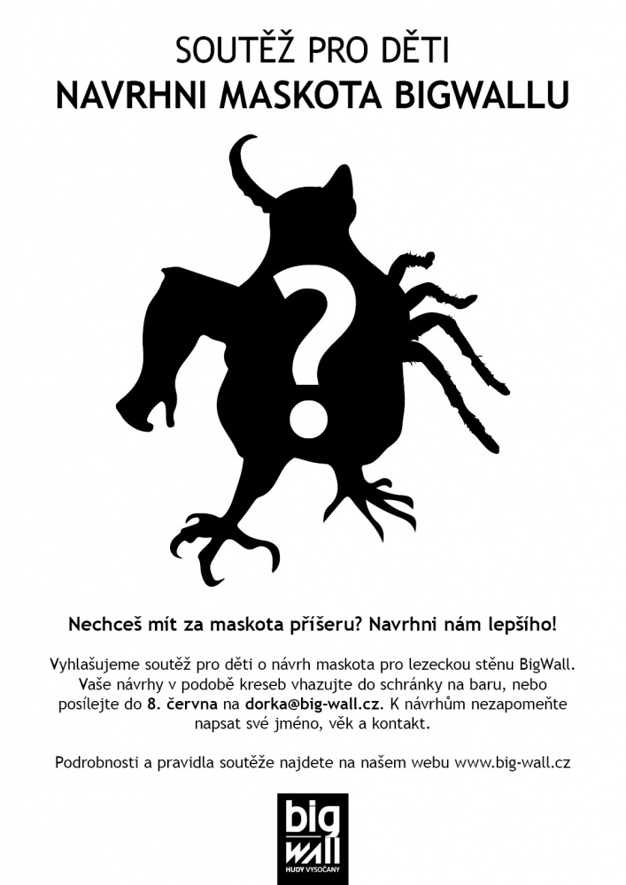 Vyhlašujeme soutěž pro děti o návrh maskota pro lezeckou stěnu BigWall. 10 nejlepších návrhů bude odměněno věcnou cenou, vítězný pak získá kromě osobní ceny také sladkou odměnu pro celý svůj lezecký kroužek!
