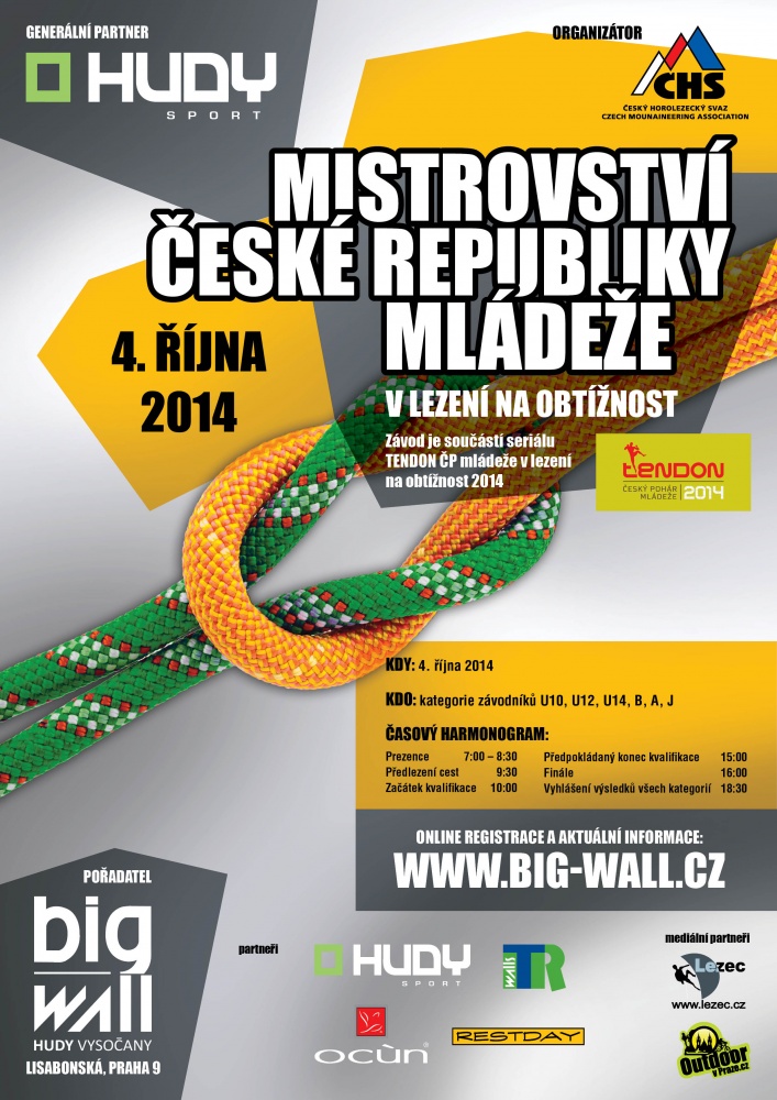 Zveme všechny mladé závodníky na otevřené Mistrovství ČR mládeže pro rok 2014, které proběhne 4. 10. 2014 na lezecké stěně BigWall v Praze Vysočanech. Závod je součástí seriálu závodů Tendon ČP, takže budou ve hře nejenom mistrovské tituly, ale i body do celkového pořadí ČP.