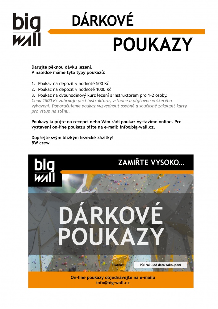 Dárkové poukazy na dvouhodinové lekce lezení nebo na složení depozitu pro vás budeme před vánočními svátky vystavovat on-line až do pondělí 22.12. 2025. V úterý 23.12. 2025 bude ještě pokračovat prodej na recepci BigWallu.