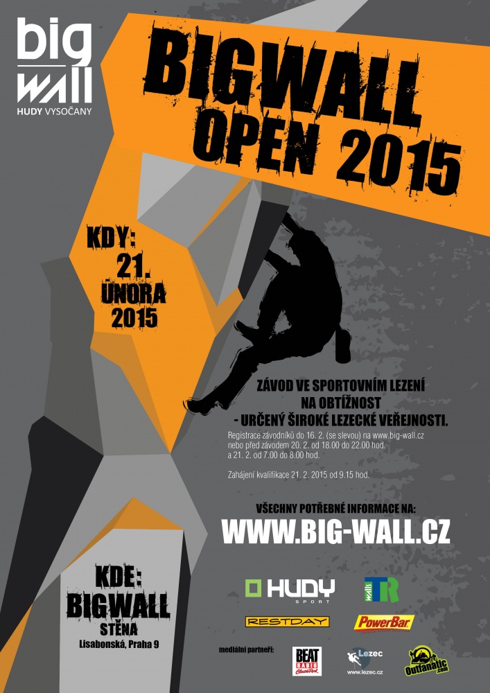 BigWall open 2015 se uskuteční v tradičním termínu 21.2.2015. Stejně jako v loňském roce pro vás bude připraveno 7 cest v obtížnostech od 4 do 9+ UIAA. Máme pro vás opět připraveny ceny v celkové hodnotě 36 000 Kč, které rozdělíme v kategoriích ELITE a HOBBY. Oproti loňskému ročníku jsme se rozhodli vyzkoušet jednu zásadní novinku. Závod bude tentokrát jednodenní. Věříme, že vám tato změna bude vyhovovat a že oželíte mužské semifinále, které jsme museli z časových důvodů obětovat. Více informací naleznete na www.big-wall.cz v sekci soutěže.