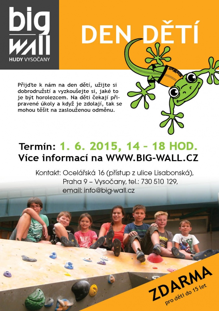 V pondělí 1. 6. mezi 14 a 18 hodinou u nás na stěně na galerii bude probíhat sportovní program pro děti v rámci Dne dětí. Děti dostanou kartičku, na kterou budou sbírat razítka za jednotlivé úkoly, které budou zaměřeny převážně na lezení. Za vyplněnou kartičku se děti mohou těšit na malou odměnu. Vstupné pro děti do 15 let je na tuto akci zdarma.