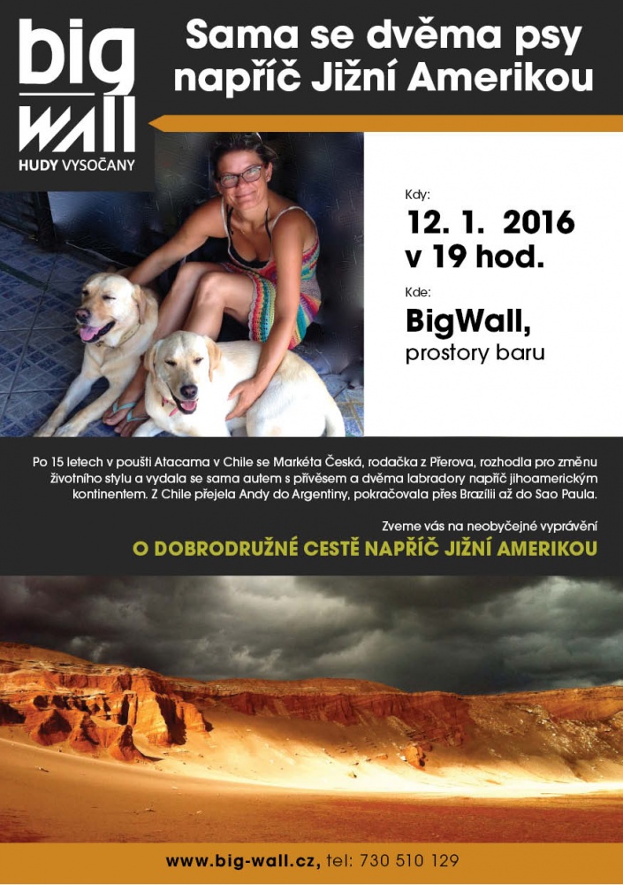 12. ledna od 19hod pro vás pořádáme přednášku na téma: Sama se dvěma psy napříč Jižní Amerikou.